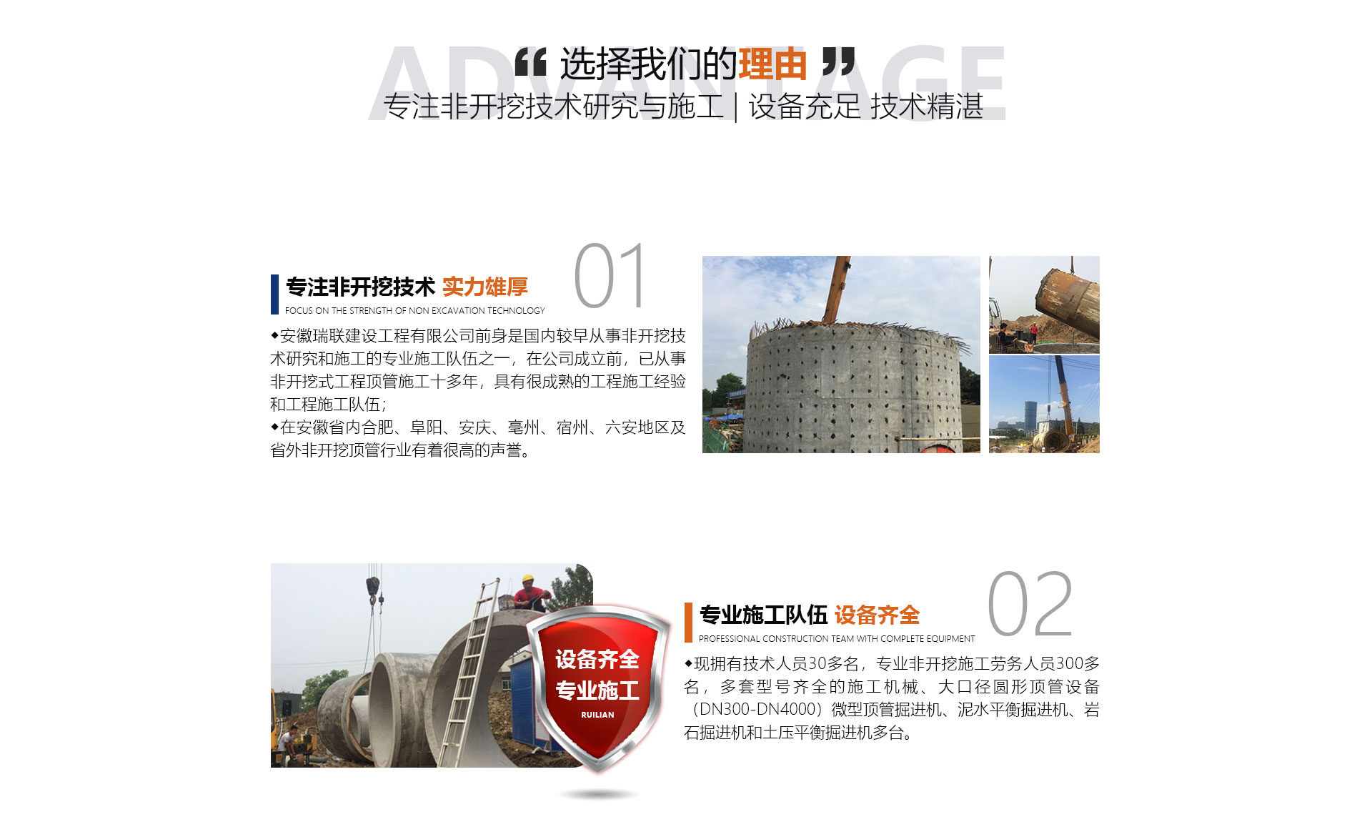 安徽瑞聯(lián)建設(shè)工程有限公司前身是國內(nèi)較早從事非開挖技術(shù)研究和施工的施工隊伍之一,在公司成立前,已從事非開挖式工程頂管施工十多年,具有很成熟的工程施工經(jīng)驗和工程施工隊伍,在安徽省內(nèi)合肥、阜陽、安慶、亳州、宿州、六安地區(qū)及省外非開挖頂管行業(yè)有著很高的聲譽。面對日益擴大的市場,公司于2014年正式成立,公司擁有勞務(wù)分包及市政公用工程總承包資質(zhì)。公司優(yōu)勢(文字):現(xiàn)擁有中高技術(shù)人員30多名,非開挖施工勞務(wù)人員300...